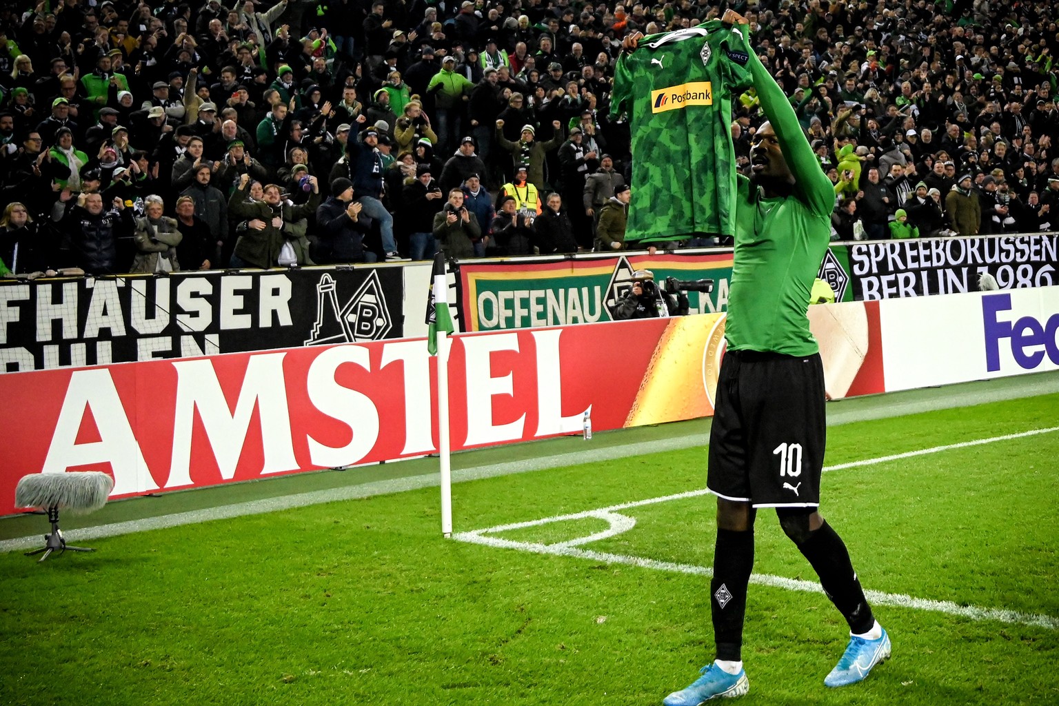 Siegtorschütze Thuram macht den Messi und zeigt den Gladbach-Fans sein Trikot.