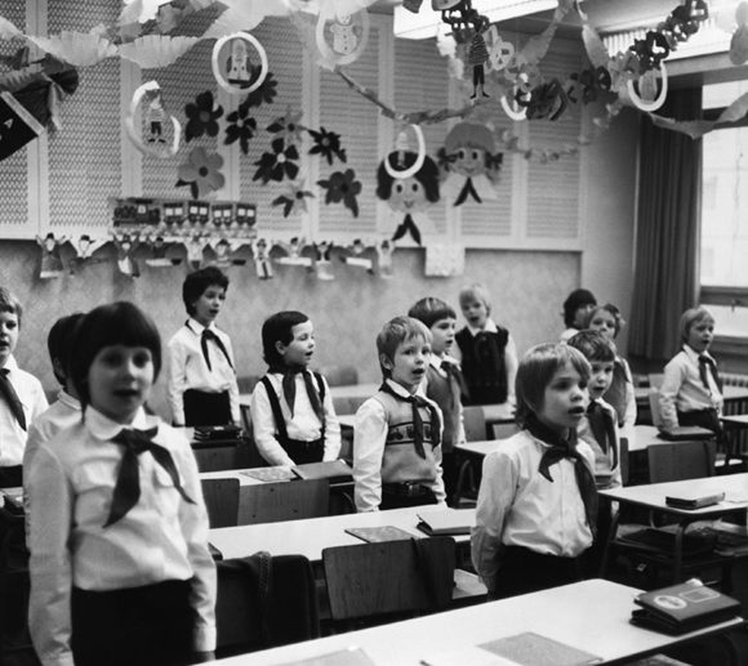 DDR-Pioniere im Klassenzimmer.