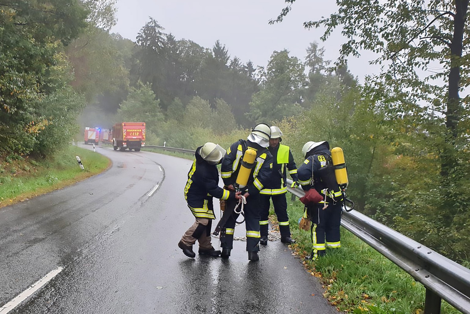 Feuerwehrleute bereiten ihre Ausrüstung nahe der Absturzstelle vor.