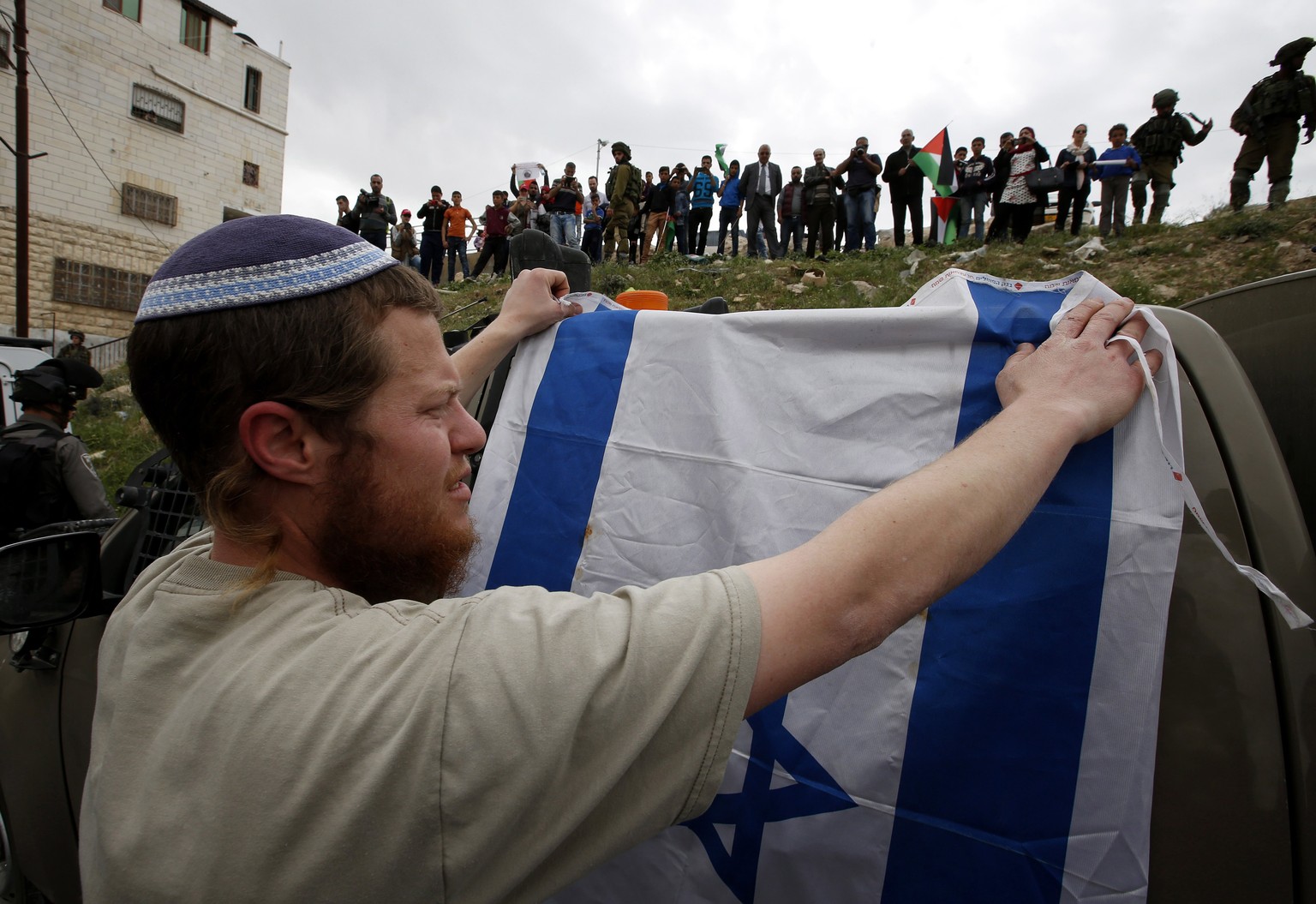 Ein jüdischer Siedler hält im Westjordanland die israelische Fahne hoch.