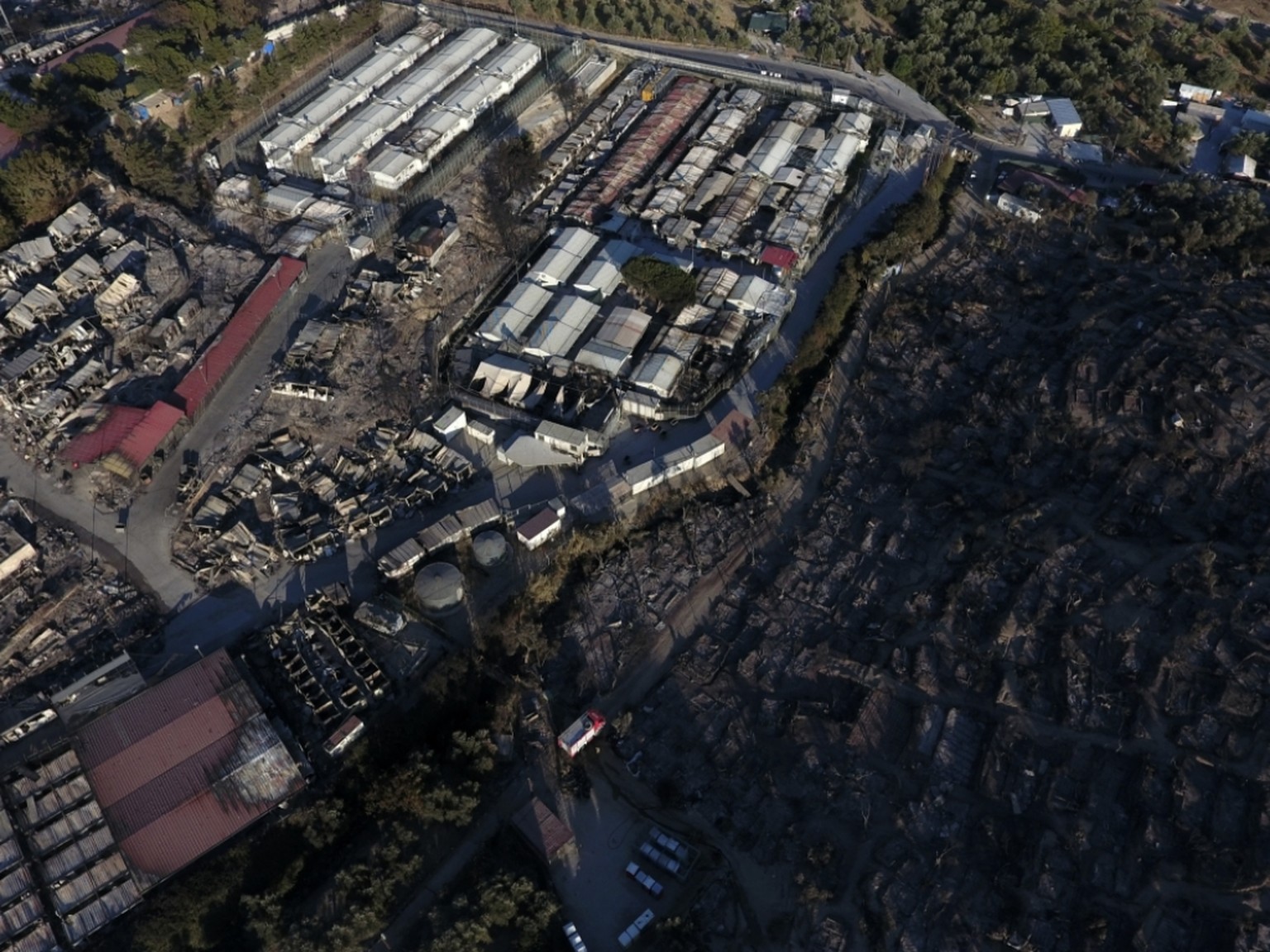 Das niedergebrannte Flüchtlingslager Moria auf der Insel Lesbos von oben. Mehrere Brände haben das Lager fast vollständig zerstört