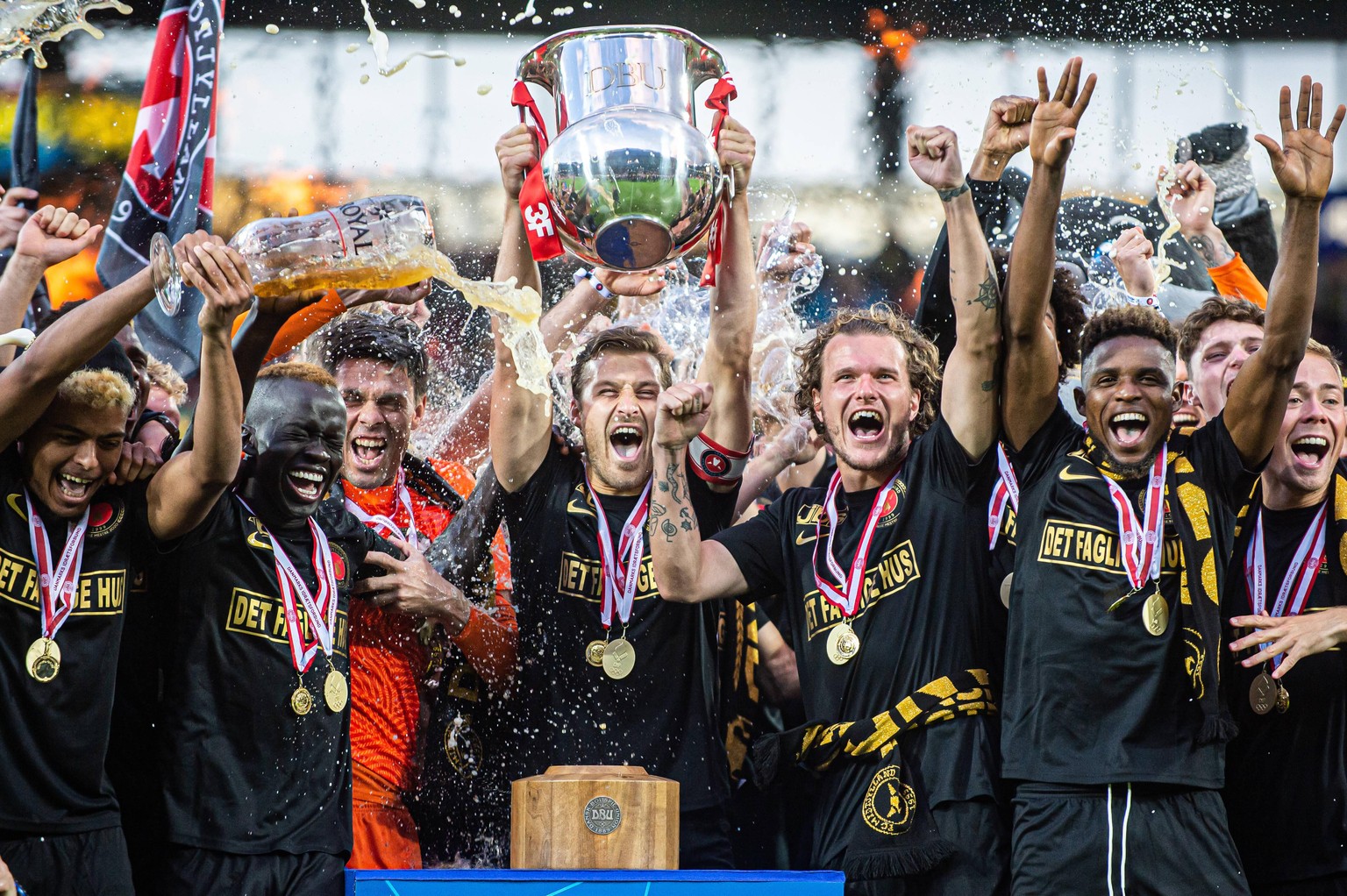 Midtjylland-Captain Erik Sviatchenko stemmt den Meisterpokal.