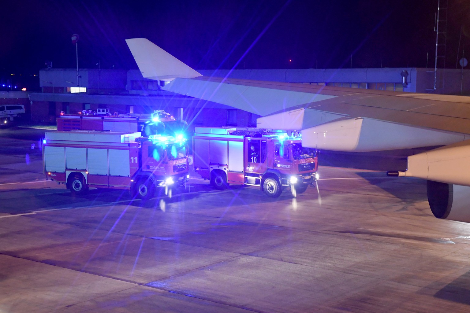 Die Feuerwehr empfängt die defekte Regierungsmaschine von Merkel in Köln-Bonn.