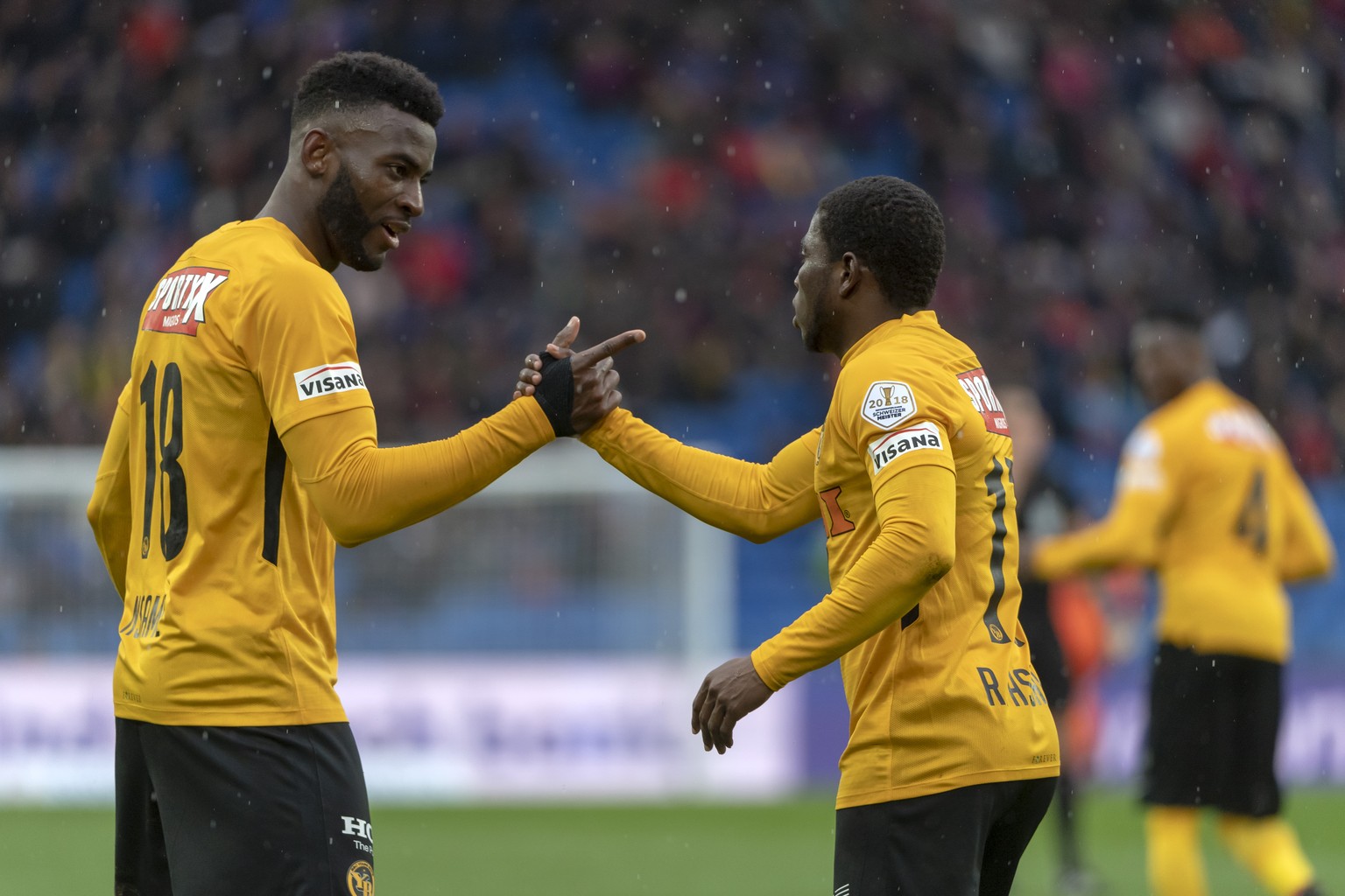 YB-Doppeltorschütze Nsame jubelt mit Kollege Assalé.