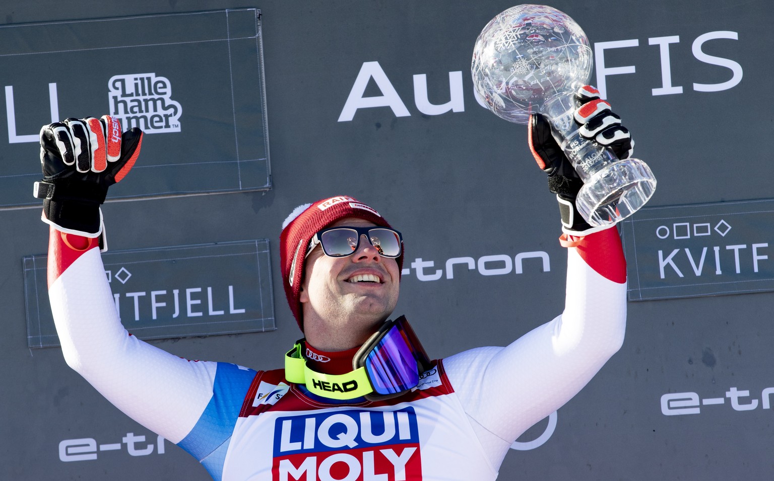 Beat Feuz jubelt mit der Kugel von Henrik Kristoffersen.