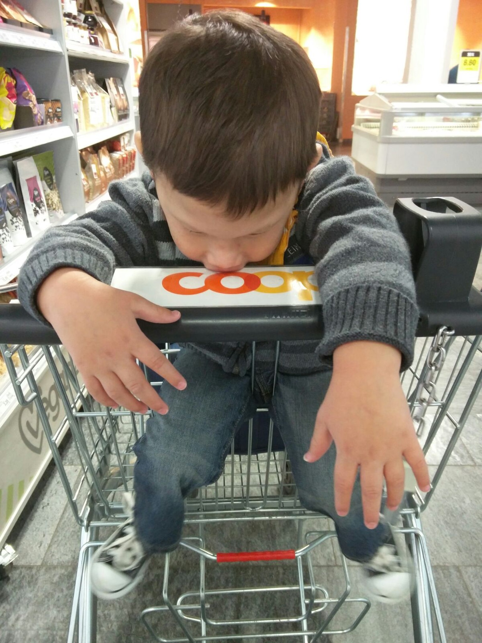 Arden in einem Standard-Einkaufswagen. Bequem sieht anders aus.
