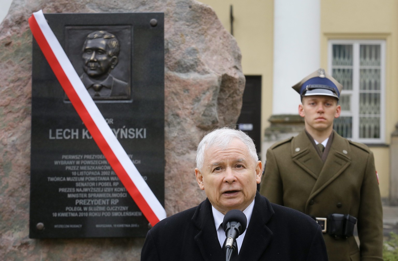 Polens starker Mann Jaroslaw Kaczynski vor einer Gedenktafel für seinen beim Absturz getöteten Zwillingsbruder.