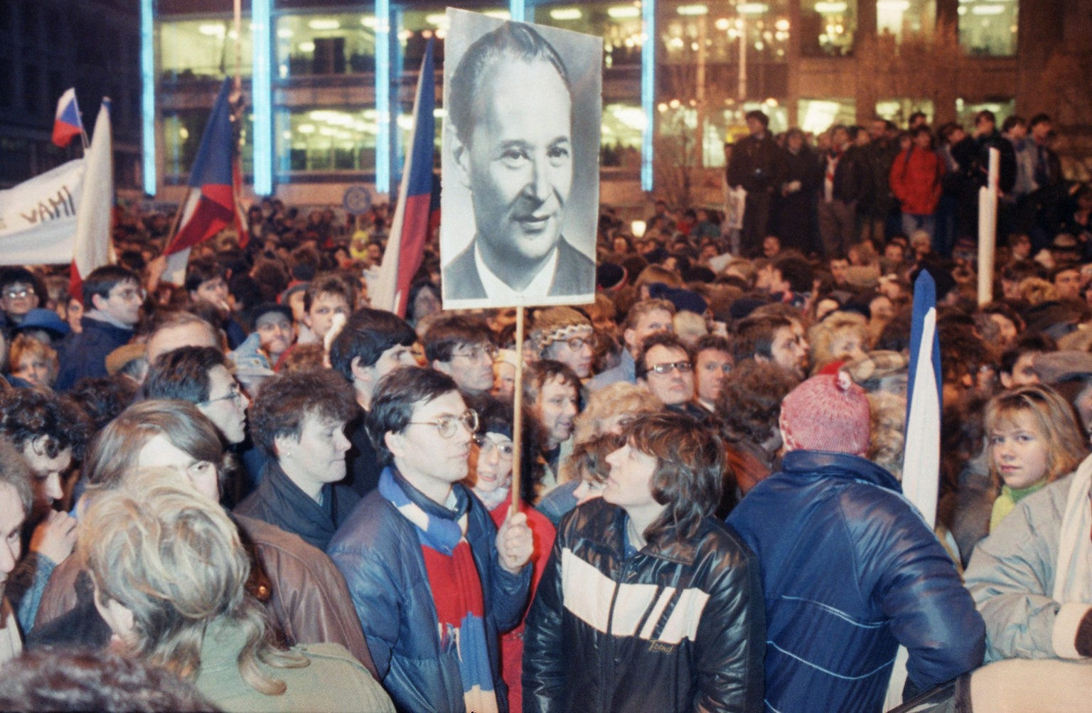 Ein Demonstrant zeigt ein Bild von Alexander Dubček, dem Anführer des Prager Frühlings 1968.