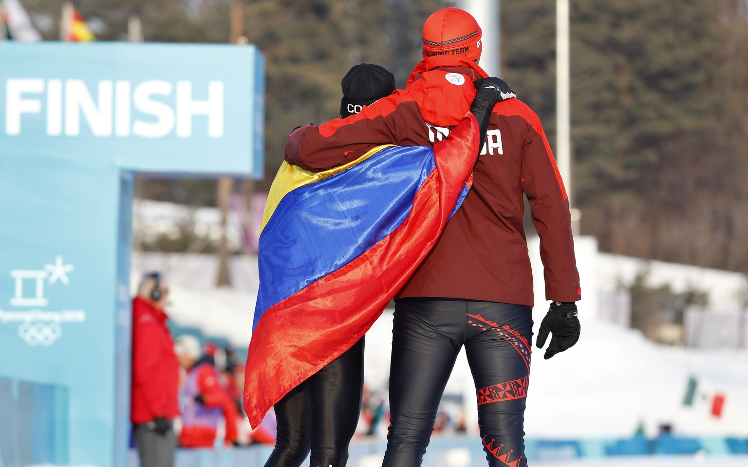 Olympischer Geist: Taufatofua wartet Arm in Arm mit Uprimny auf den Zieleinlauf von Schlusslicht Madrazo.