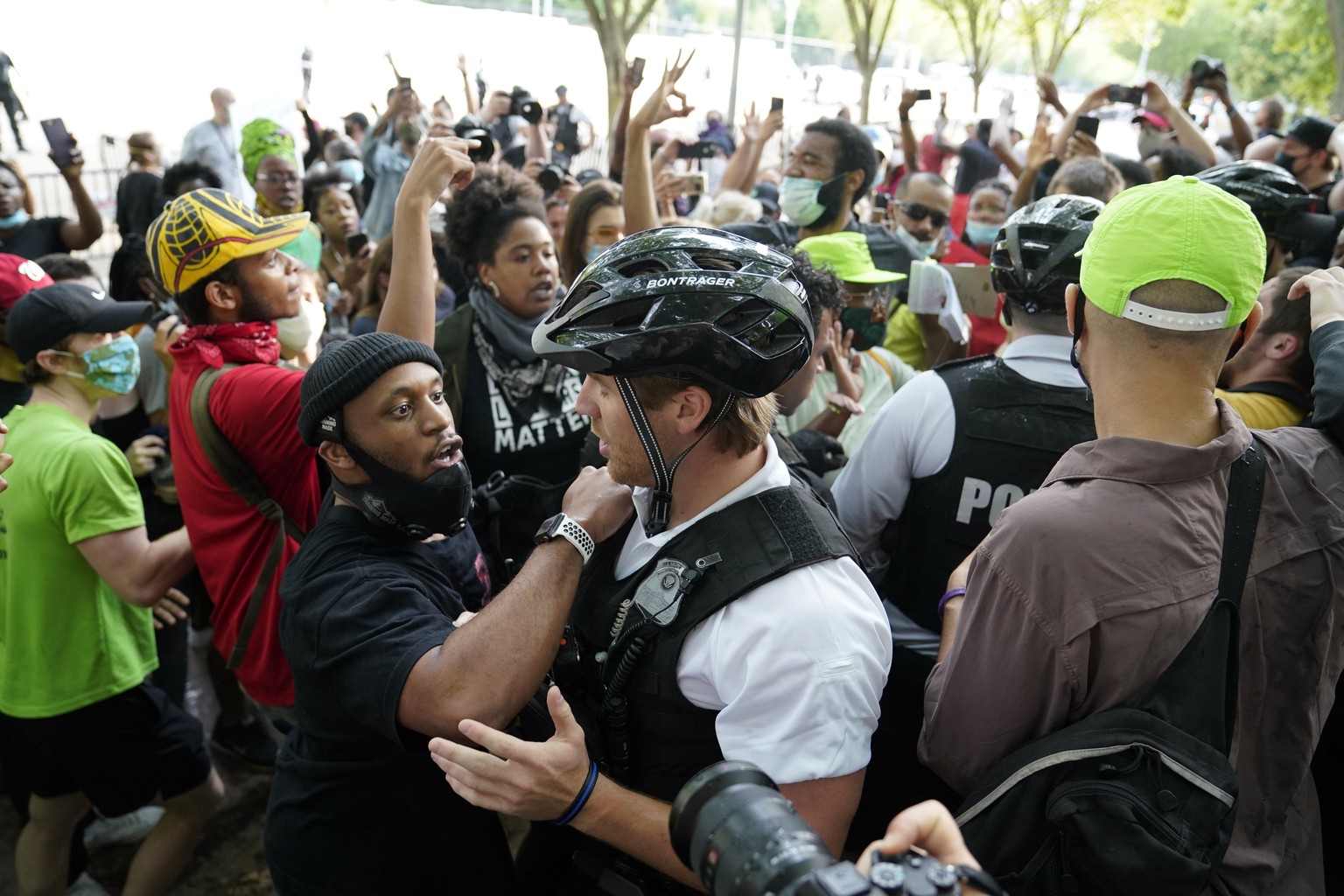 Ein Demonstrant diskutiert mit einem Beamten des Secret Service vor dem Weissen Haus.