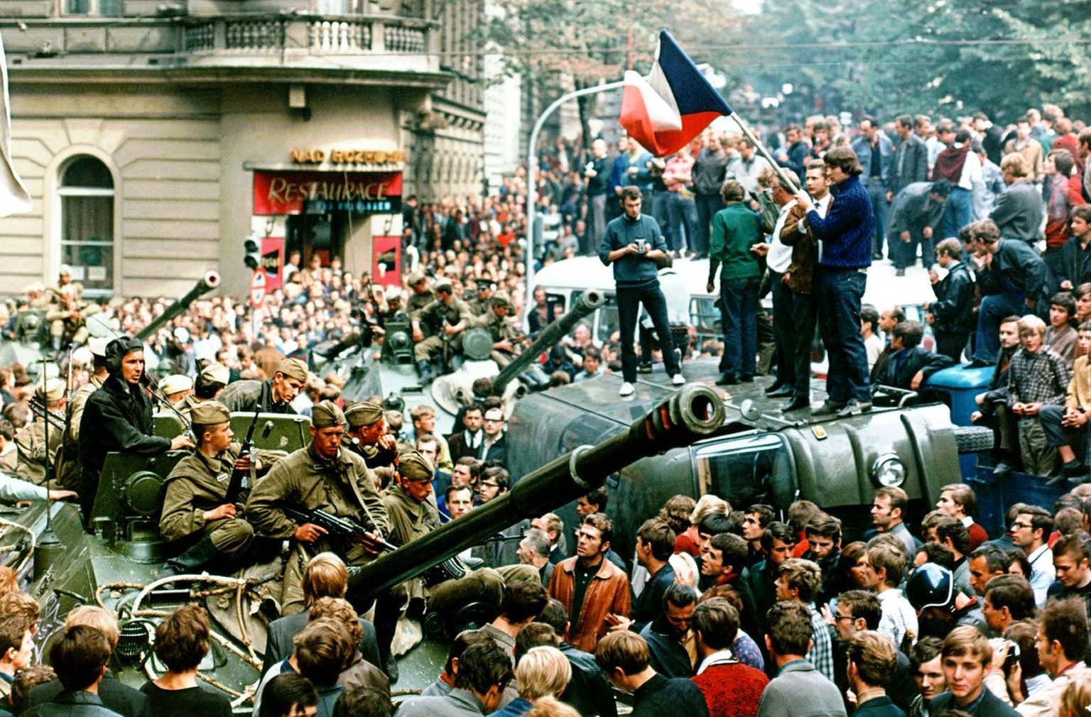 Prager Buerger mit tschechischer Flagge stehen auf einem umgestuerzten Wagen vor einem sowjetischen Panzer.