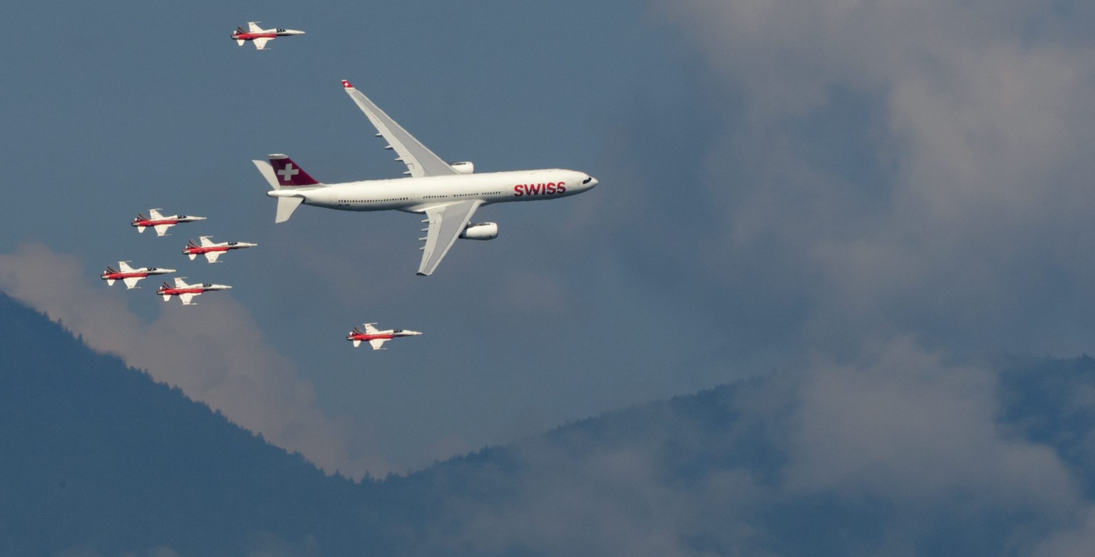 Im Tiefflug über Payerne: Eine A330 der Swiss wird von F-5E Tigers der Patrouille Suisse exkortiert.