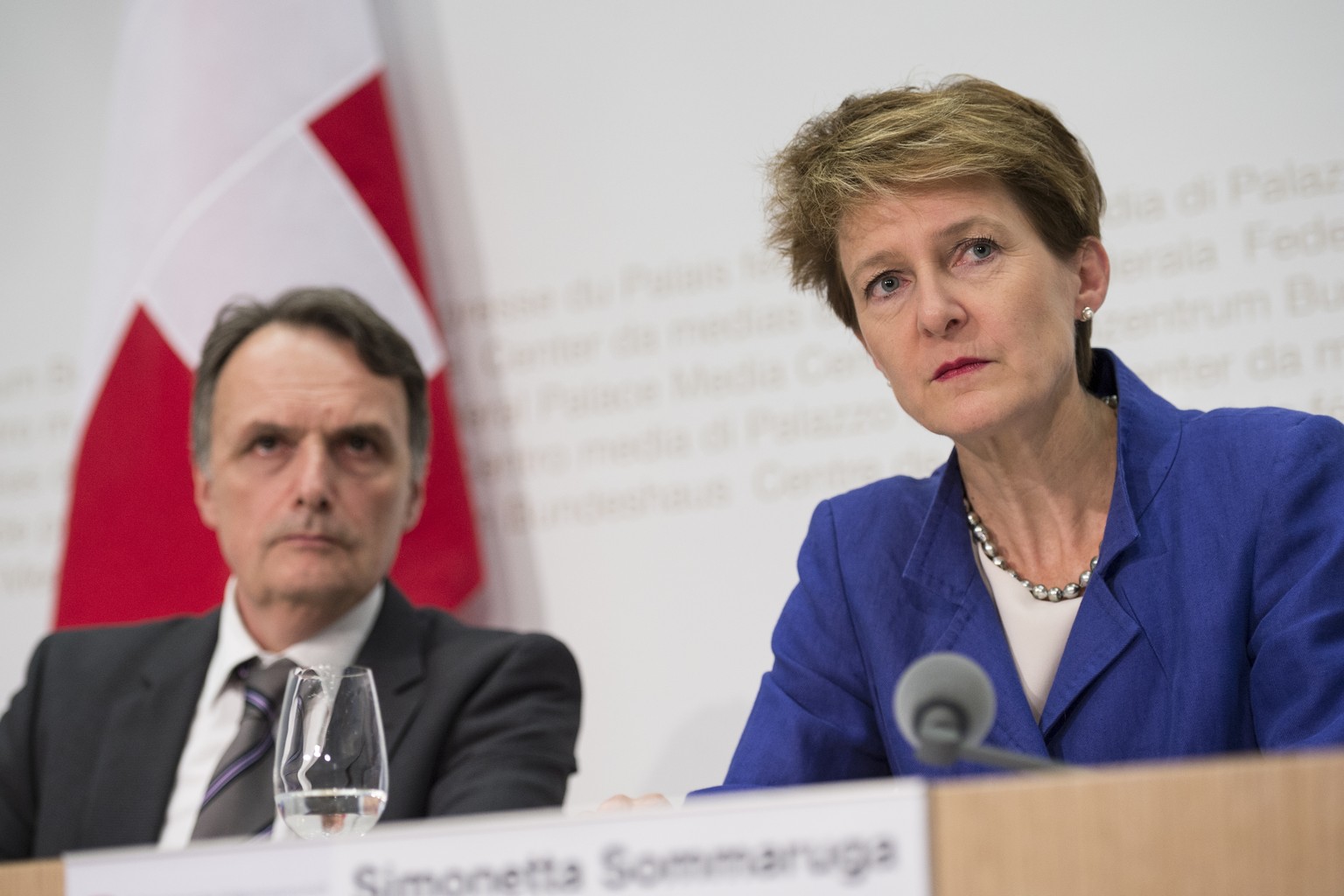 Bundesrätin Simonetta Sommaruga und Mario Gattiker, Direktor des Bundesamtes für Migration, am Freitag vor den Medien.