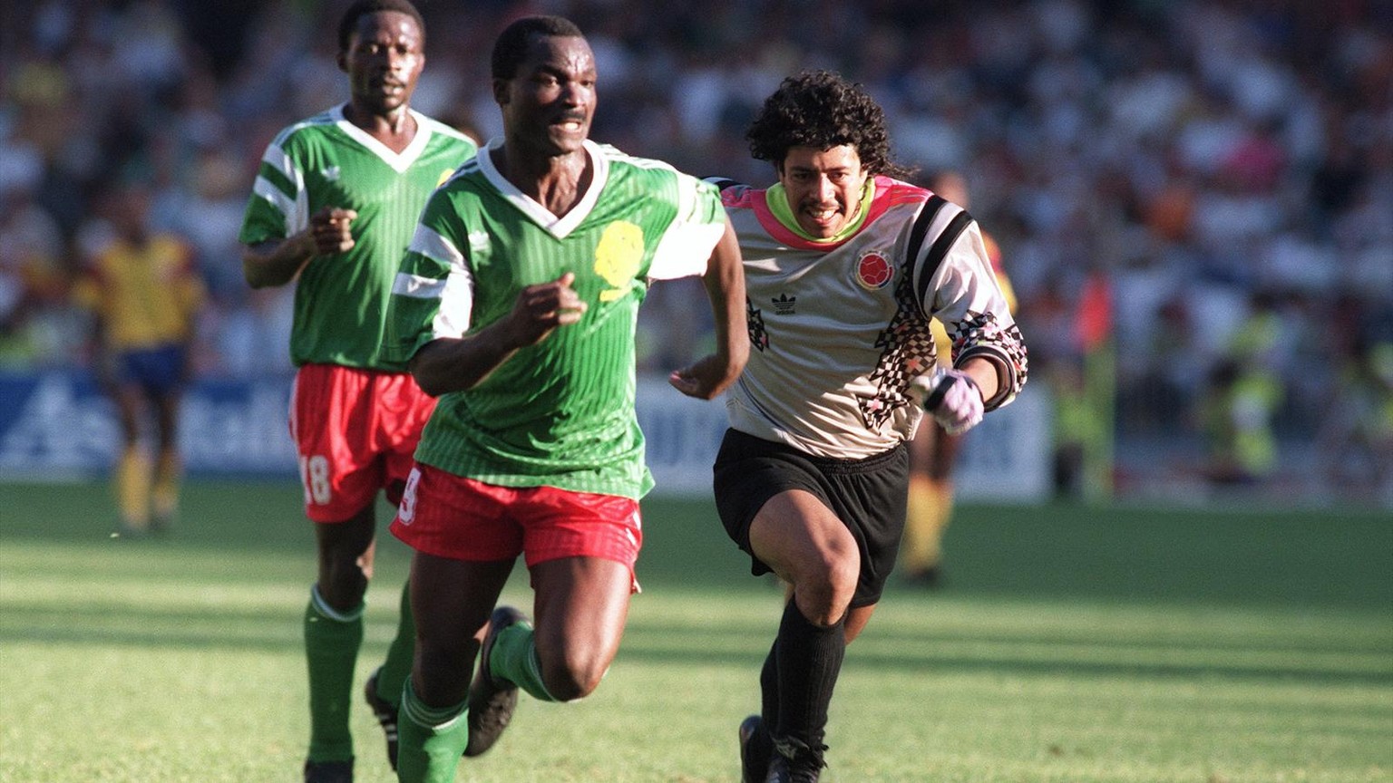 Roger Milla im Laufduell mit René Higuita.