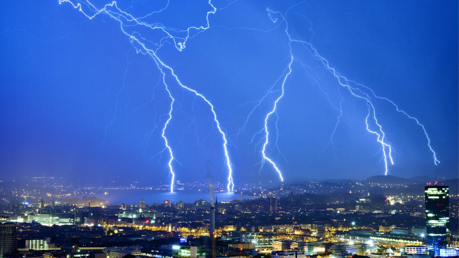 In Ermangelung eines Bildes von Gewittertierchen: Ein Gewitter mit zahlreichen Blitzen über Zürich.