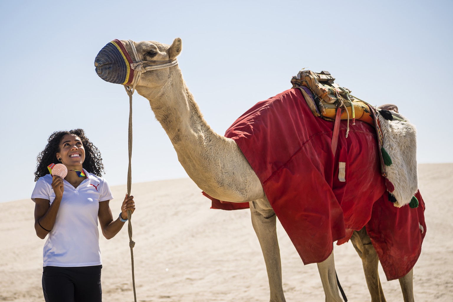 Kambundji posiert mit Medaille und Kamel.