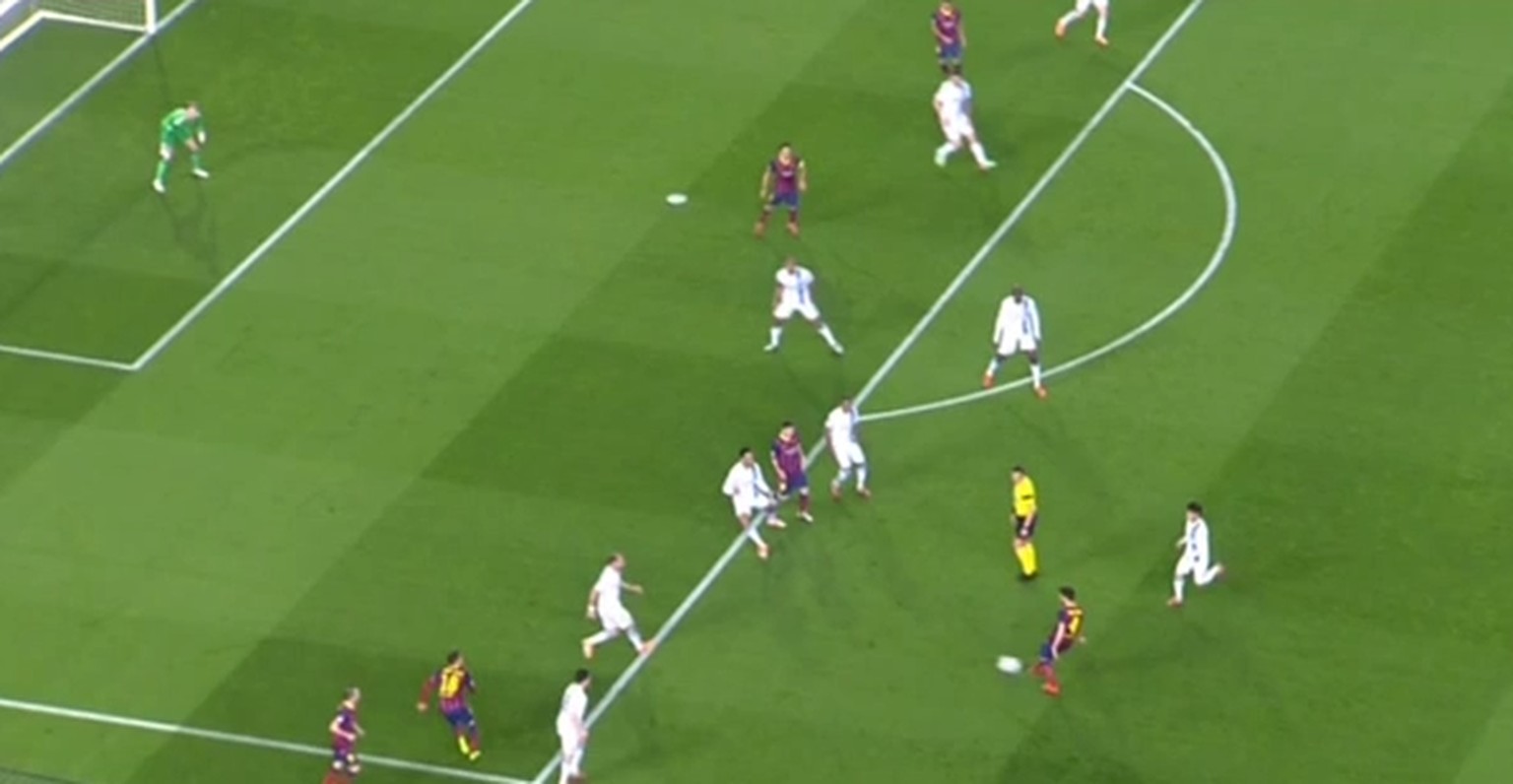Aus einem anderen Blickwinkel wird ersichtlich, dass das Tor hätte zählen müssen – allerdings war die Situation für den Linienrichter sehr schwierig zu beurteilen. Alba, unten links am Strafraumeck, wird angespielt, er steht nicht im Abseits; der spätere Torschütze Neymar schon.