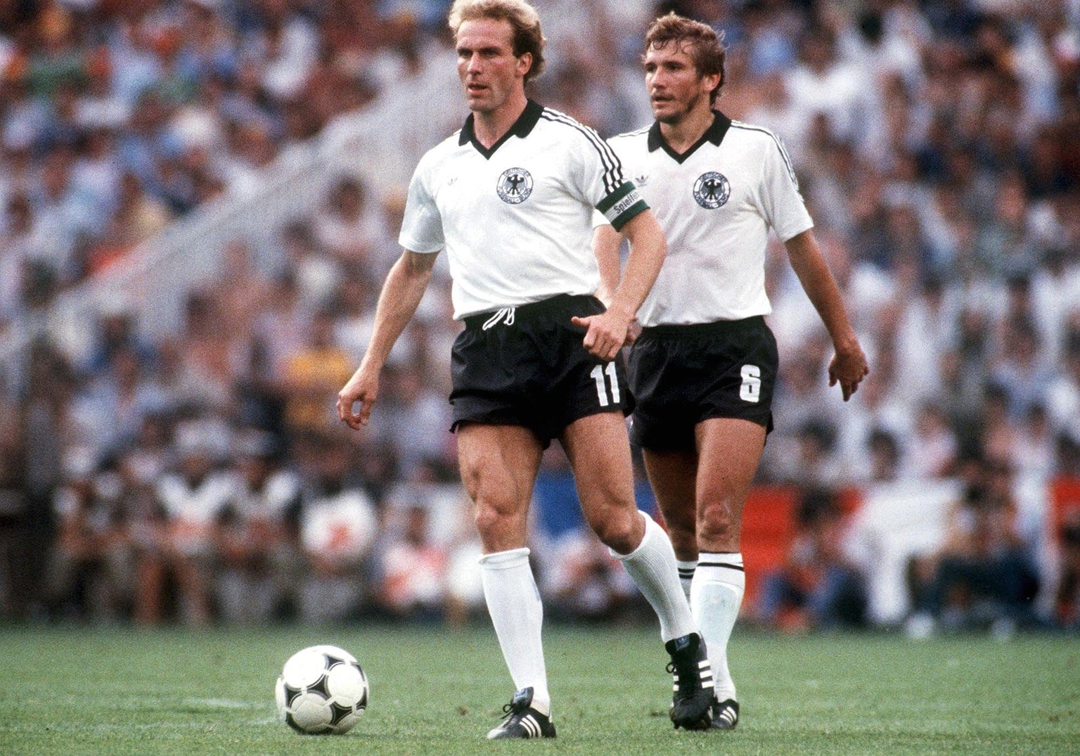Kapitän der 82er-Truppe war der heutige Bayern-Vorstandsvorsitzende Karl-Heinz Rummenigge, der hier den Ball führt.