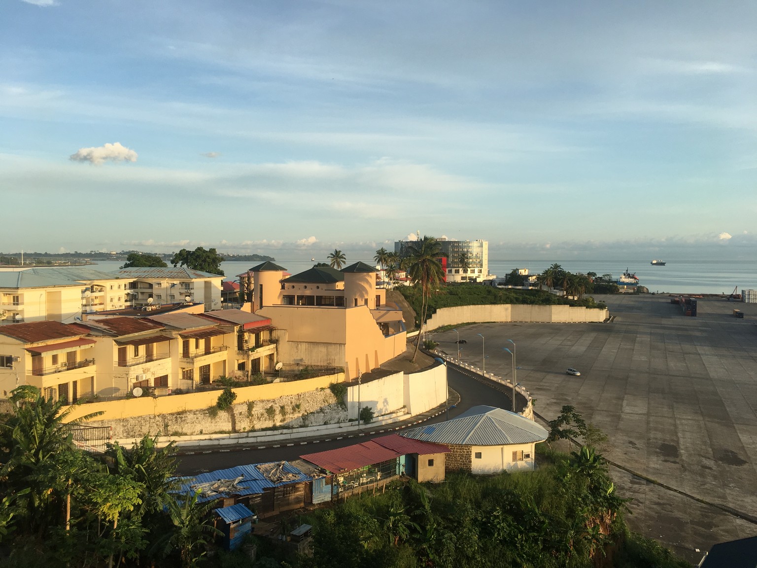 Der Ausblick vom Appartement Pierre Duperriers Richtung Hafen und Meer. Die beiden Türme in der Mitte gehören zum Complejo la Luna, wo das Restaurant dazugehört.