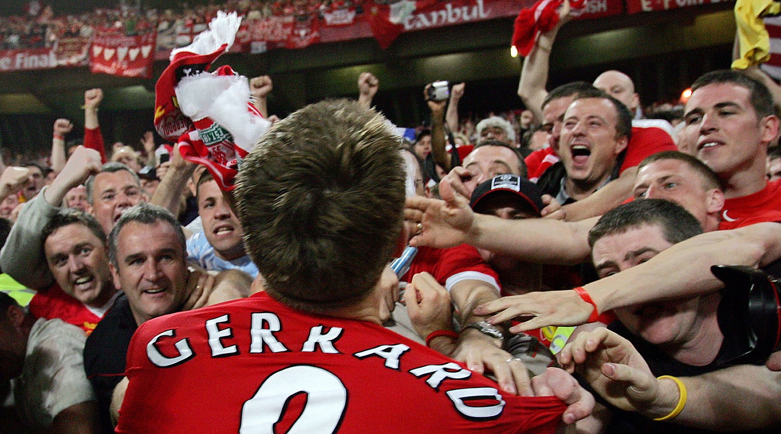 Einer von ihnen: Gerrard feiert mit Liverpool-Fans den Triumph in der Champions League im Jahr 2005.