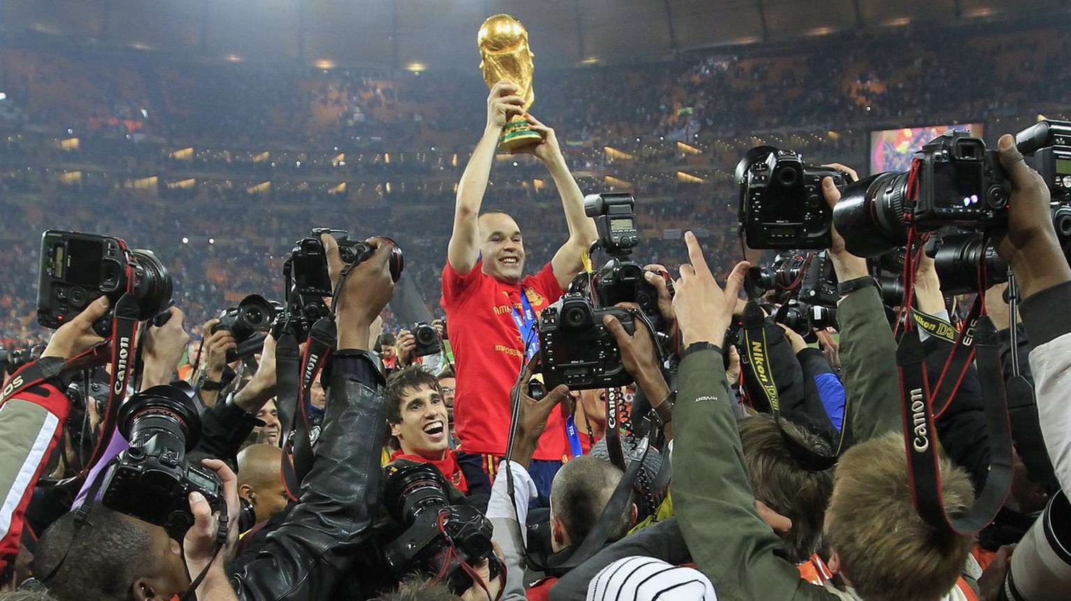 Andres Iniesta mit dem WM-Pokal 2010, nachdem er Spanien im Final zum Titel geschossen hatte.