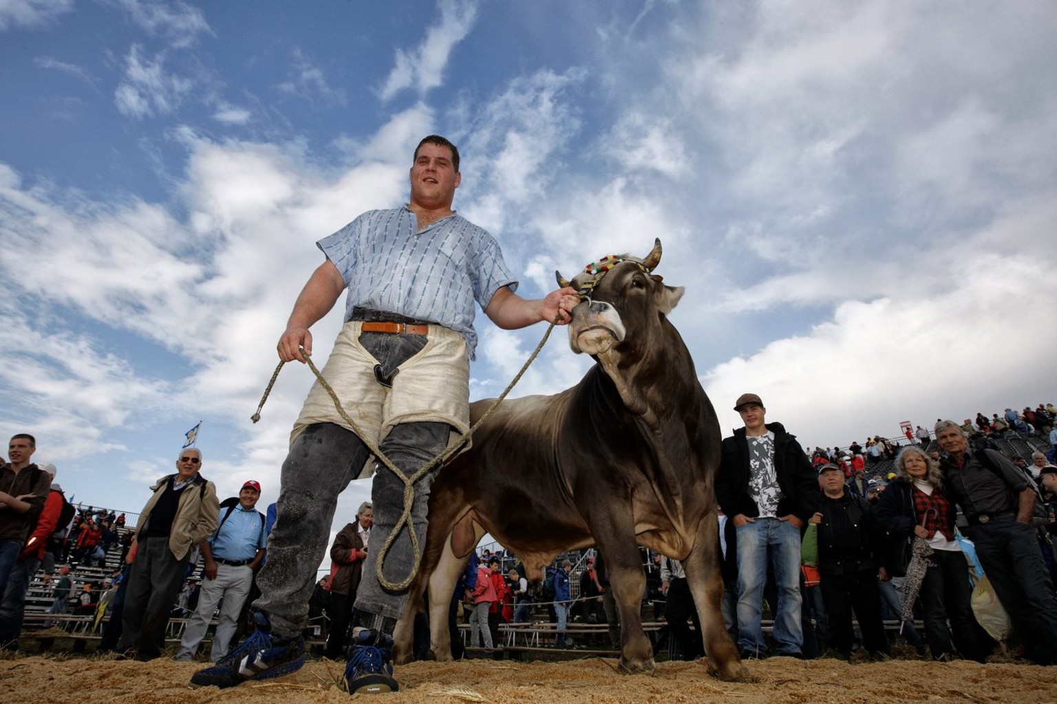 Christian Stucki mit Siegermuni nach dem Sieg am 15. Kilchberger Schwinget 2008. Der