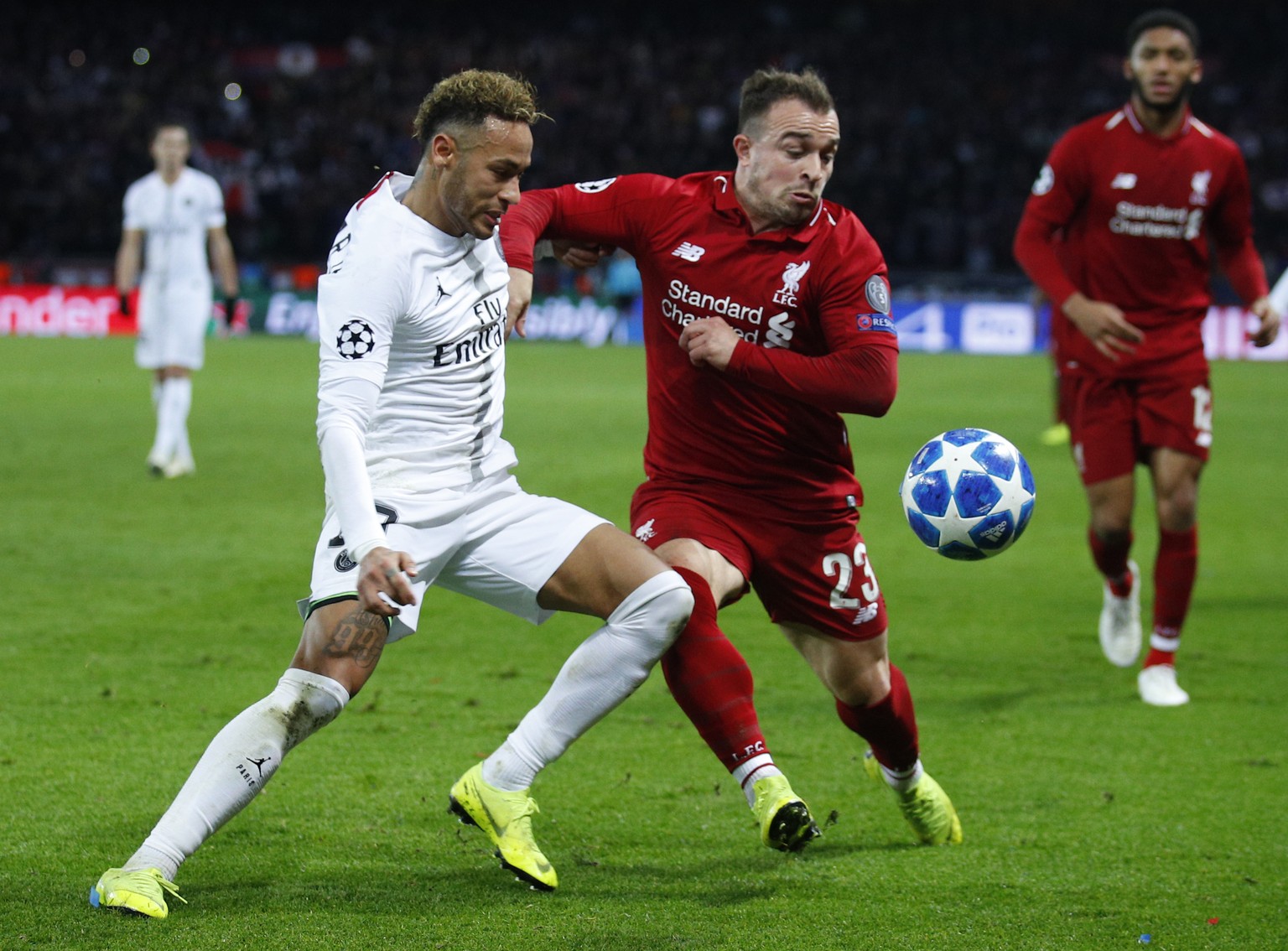Neymar im Duell im Xherdan Shaqiri. Der Schweizer hatte schon bessere Ratings als in diesem Jahr.