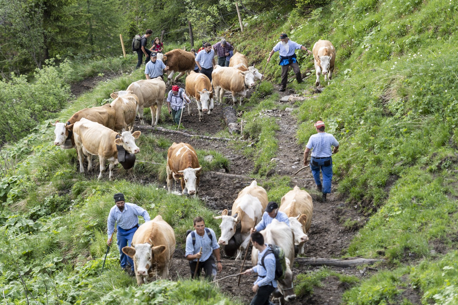 Kühe beim Alpaufzug in Adelboden. In der Schweiz stimmt die Bauern-Idylle noch teilweise.