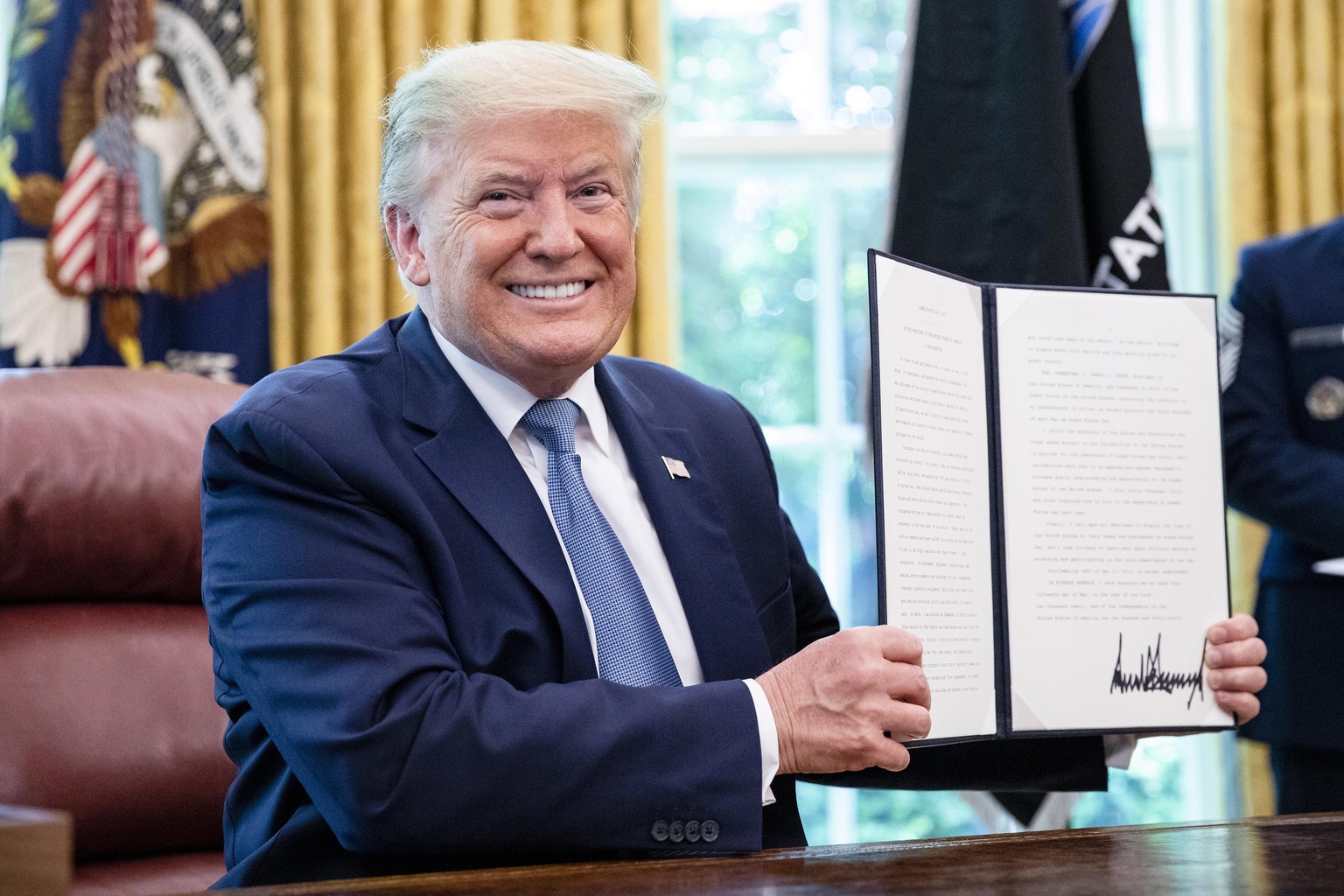 Donald Trump bei seiner Vorstellung der Flagge der neuen «Space Force».