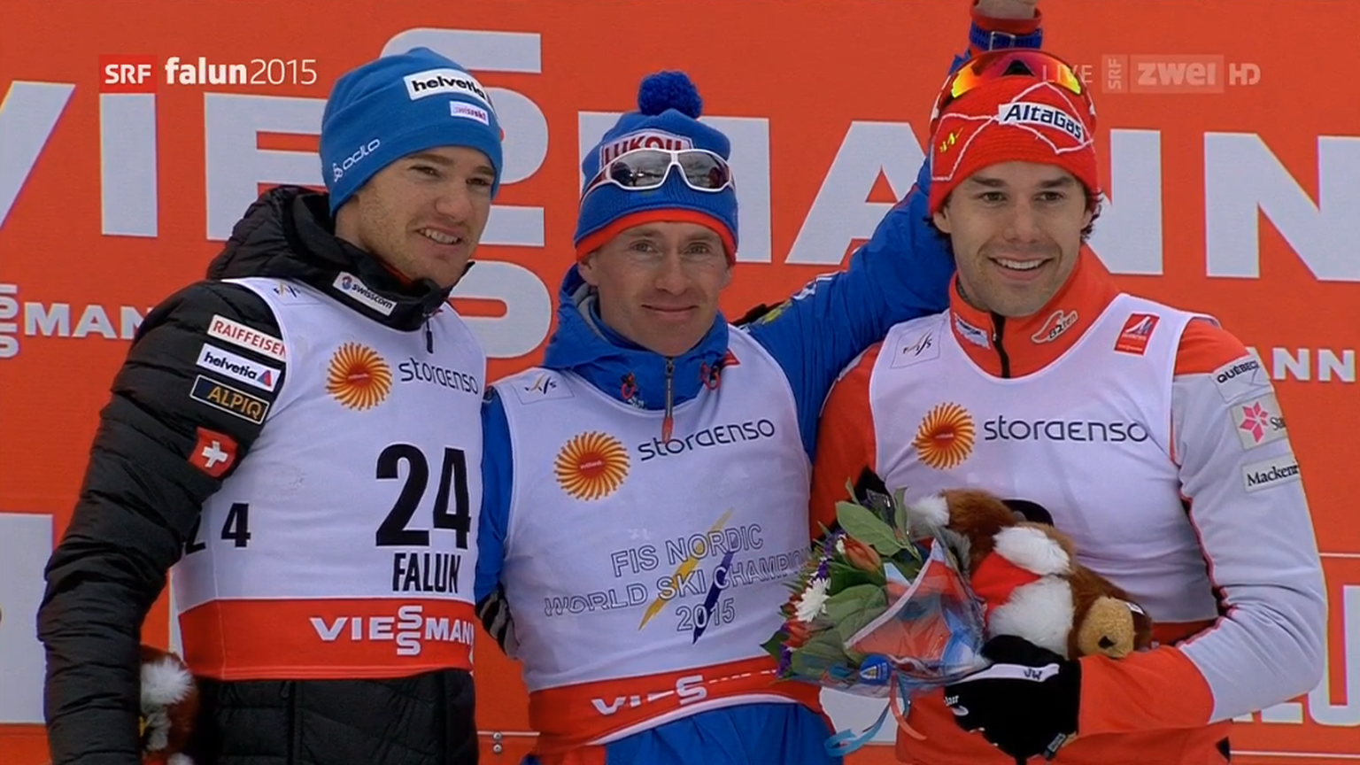 Dario Cologna mit Sieger Maxim Wylegschanin und dem Drittplatzierten Alex Harvey.
