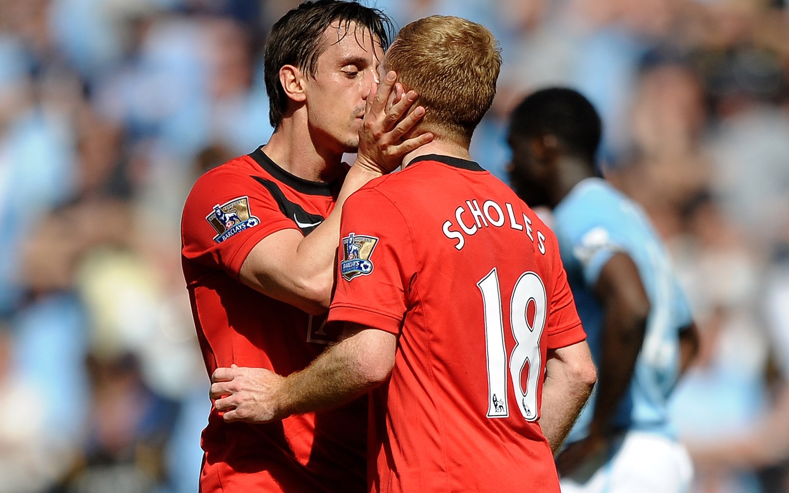 Phil Neville verpasst Paul Scholes einen innigen Kuss nach dessen Tor gegen Manchester City.