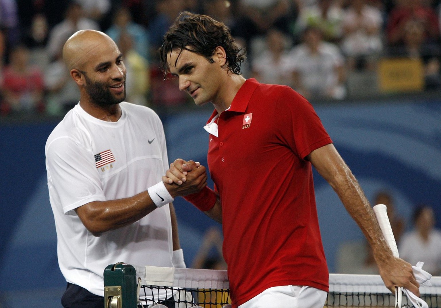 Ein enttäuschter Roger Federer muss James Blake zum Sieg gratulieren.