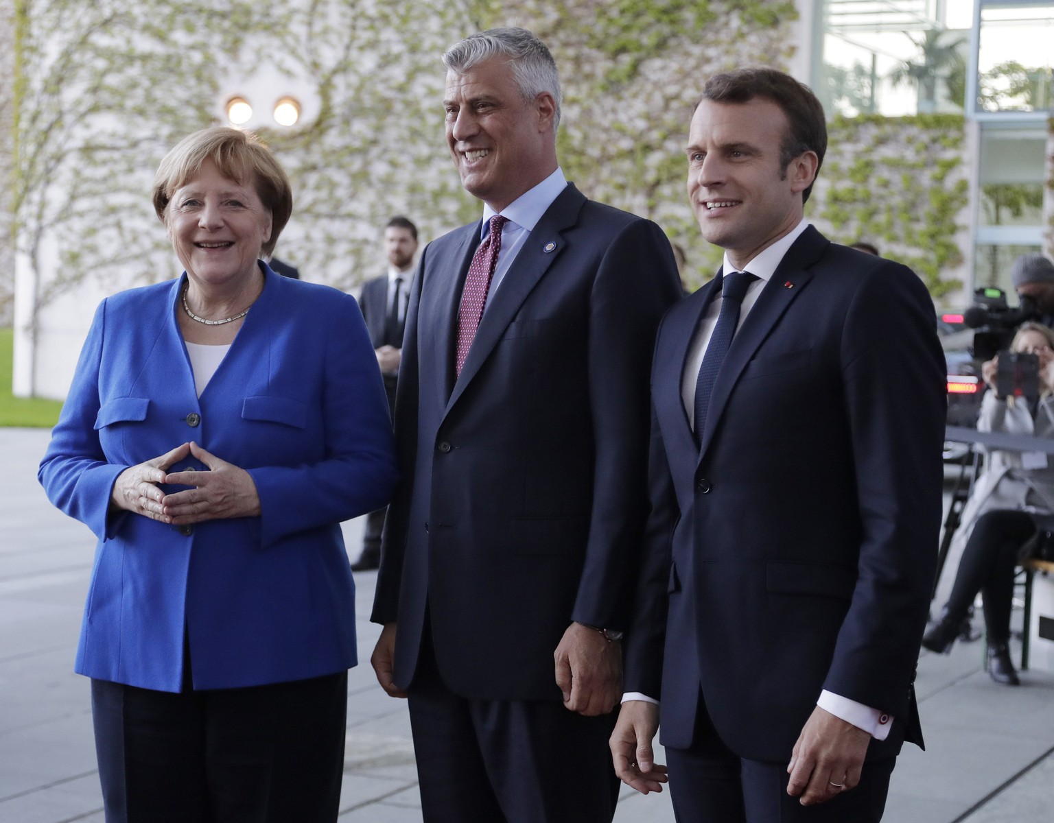 Angela Merkel, Emmanuel Macron und in der Mitte der Präsident von Kosovo, Hashim Thaci.