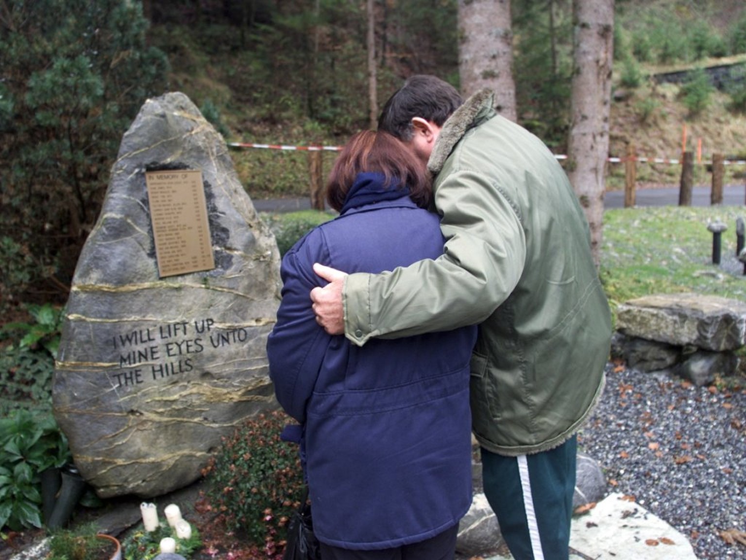 Angehörige eines der Opfer des Canyoning-Unglücks trauern beim Gedenkstein in der Nähe des Saxetbachs.