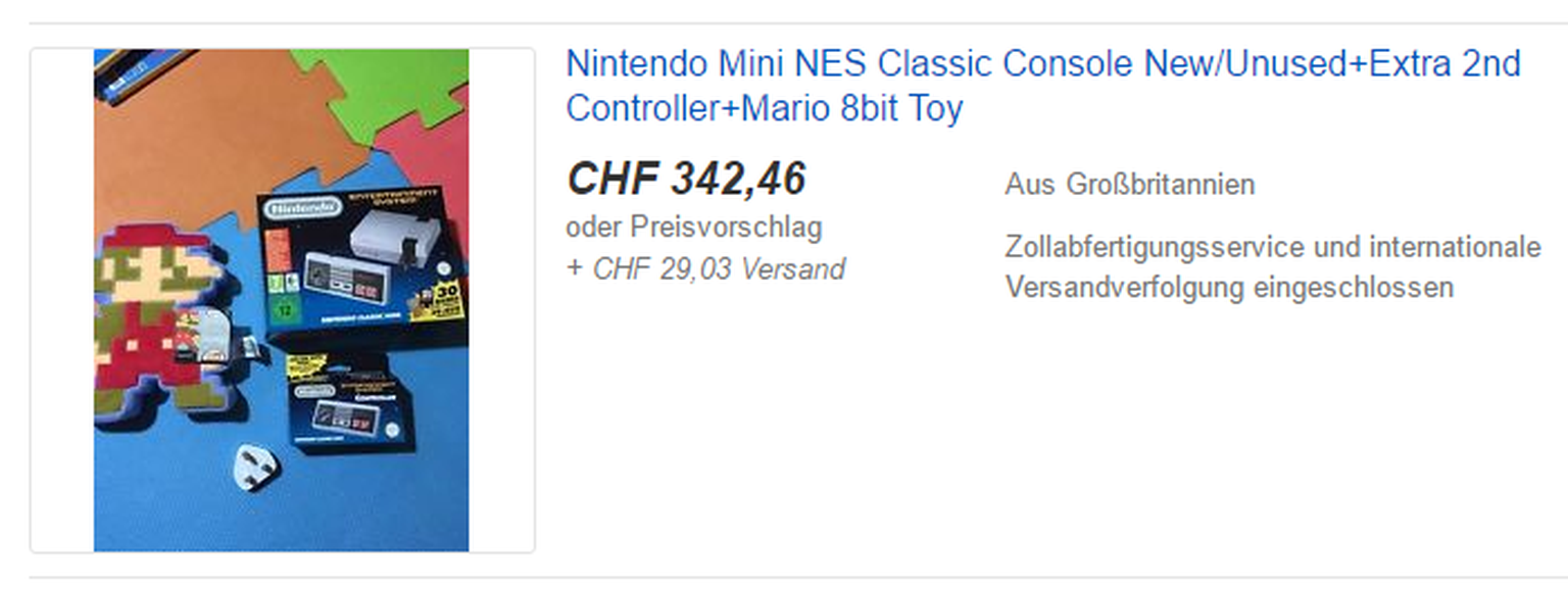 342 Franken für das Nintendo Mini NES mit separatem Zusatzcontroller und einem Mario-Spielzeug.