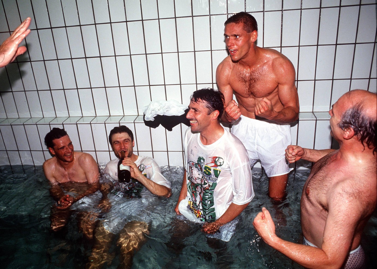 Kasalla! Der gestählte Thorsten Legat sorgt bei der Meisterfeier 1993 für Stimmung.