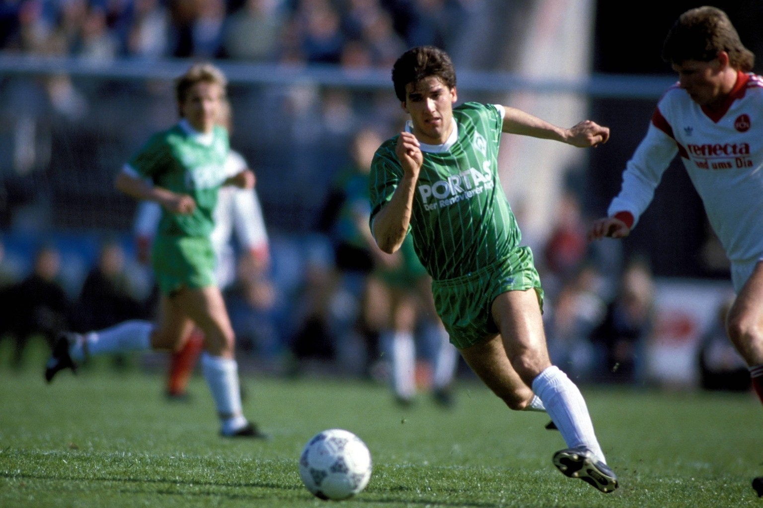 Nochmals zwei, die später gemeinsam Weltmeister wurden: Karlheinz Riedle gegen Nürnbergs Stefan Reuter.