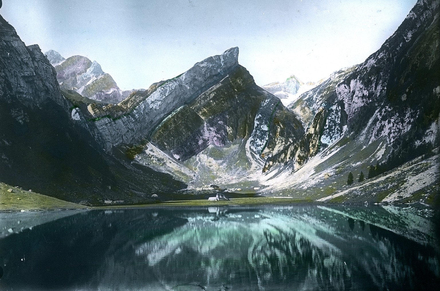 Seealpsee-Rossmad-Säntis, auf 1141 m ü. M. im Alpsteingebiet, Appenzell, Schweiz, 1906.