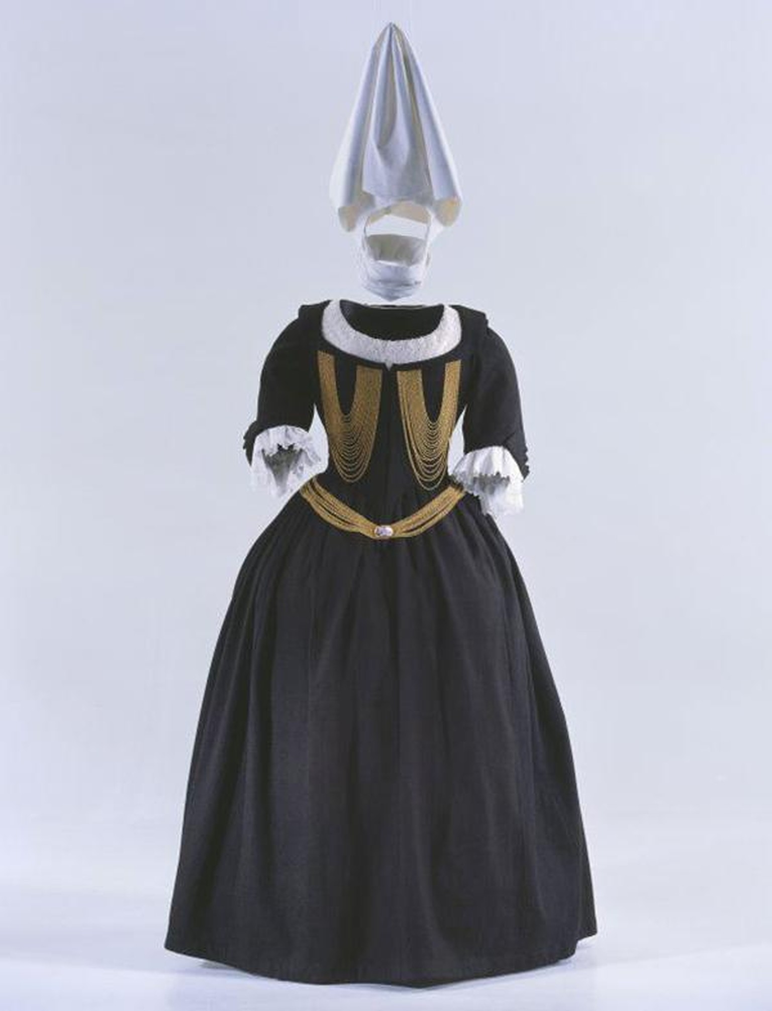 Zürcher Kirchenkleid aus der ersten Hälfte des 18. Jahrhunderts. Der Schleier wurde rekonstruiert.