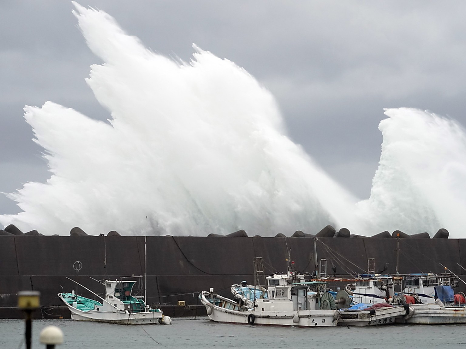 Vorboten des Taifuns Hagibis: Starke Wellen brechen an Schutzbauten im japanischen Meereshafen von Kiho.