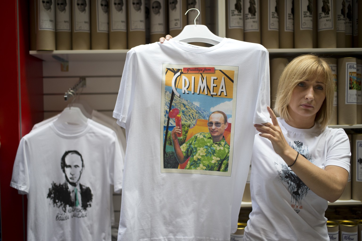Grüsse von der Krim: Präsident Putin auf T-Shirts, die in Moskau verkauft werden.