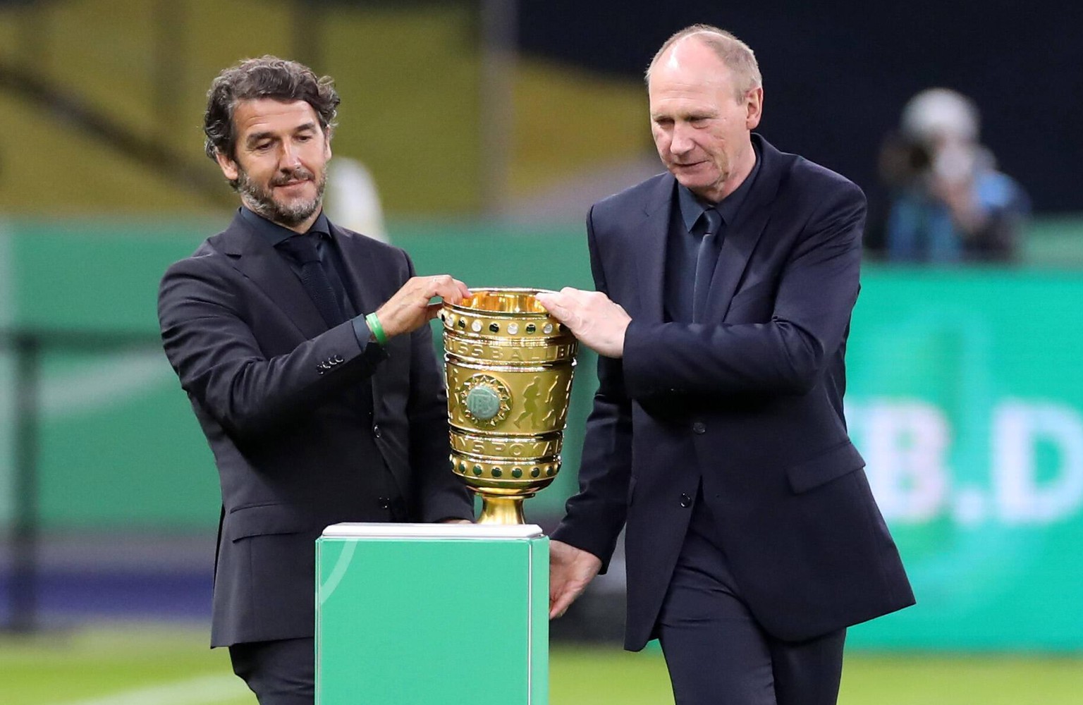 Riedle und Bräutigam bringen vor dem Spiel den Pokal ins Stadion.