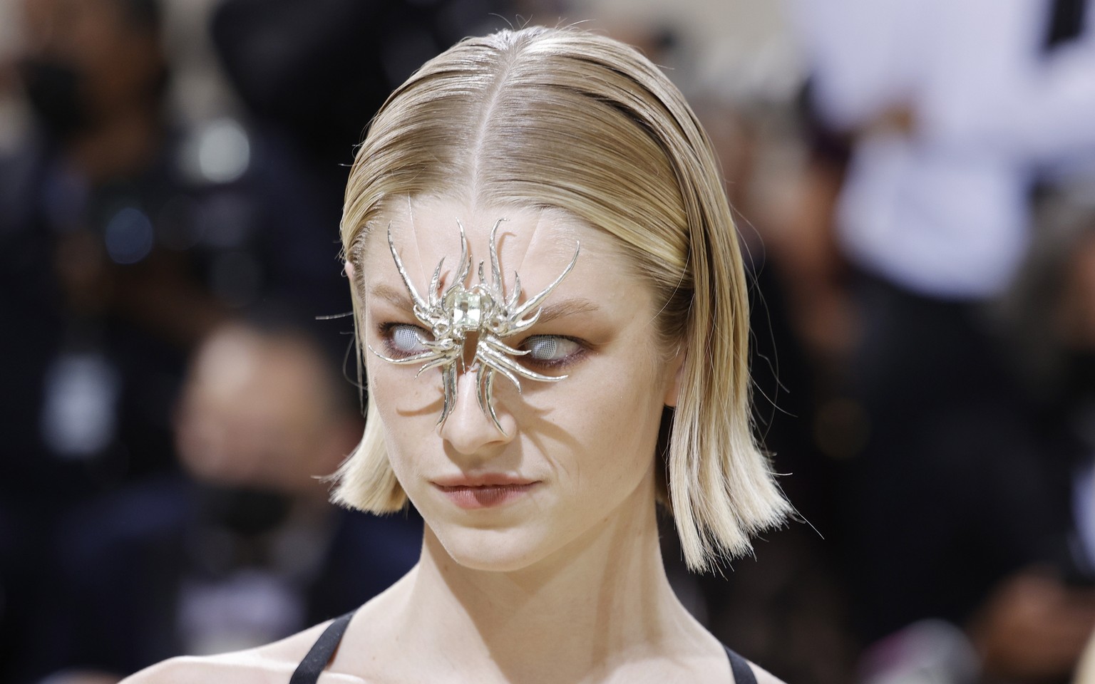 Schauspielerin Hunter Schafer mit Glitzerspinne im Gesicht.