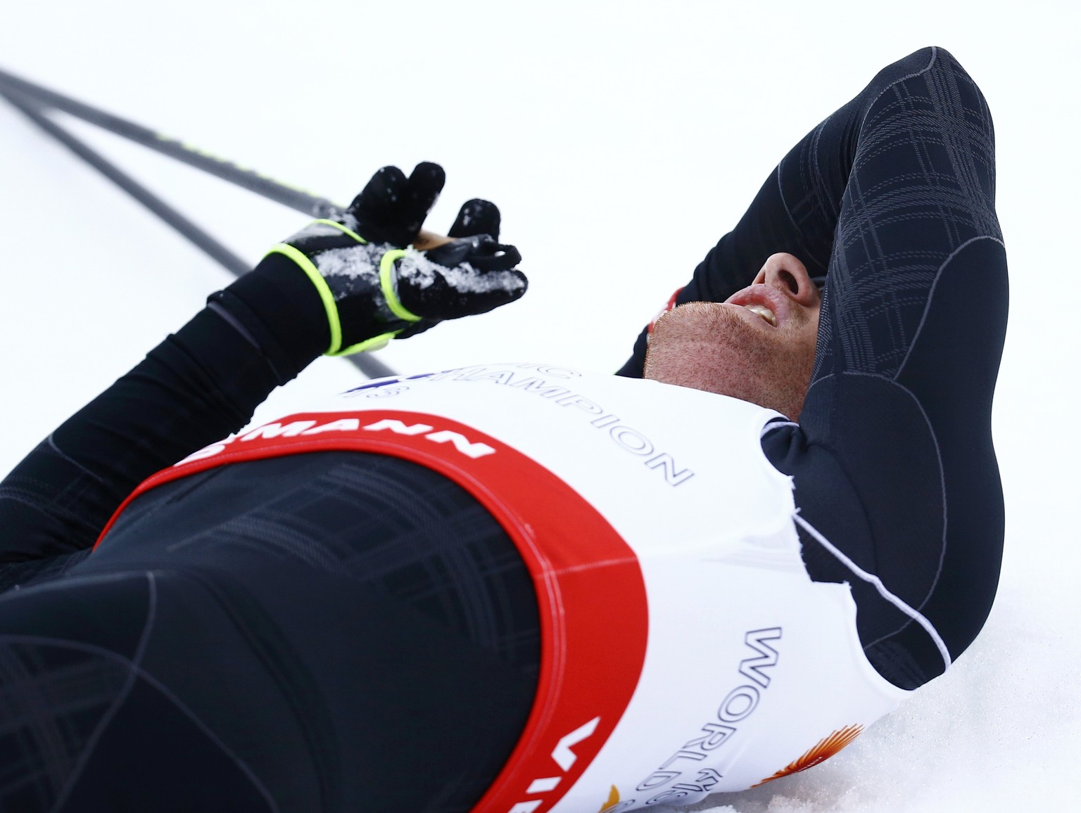 Dario Cologna liegt nach dem Schlusssprint völlig ausgepumpt im Zielraum.