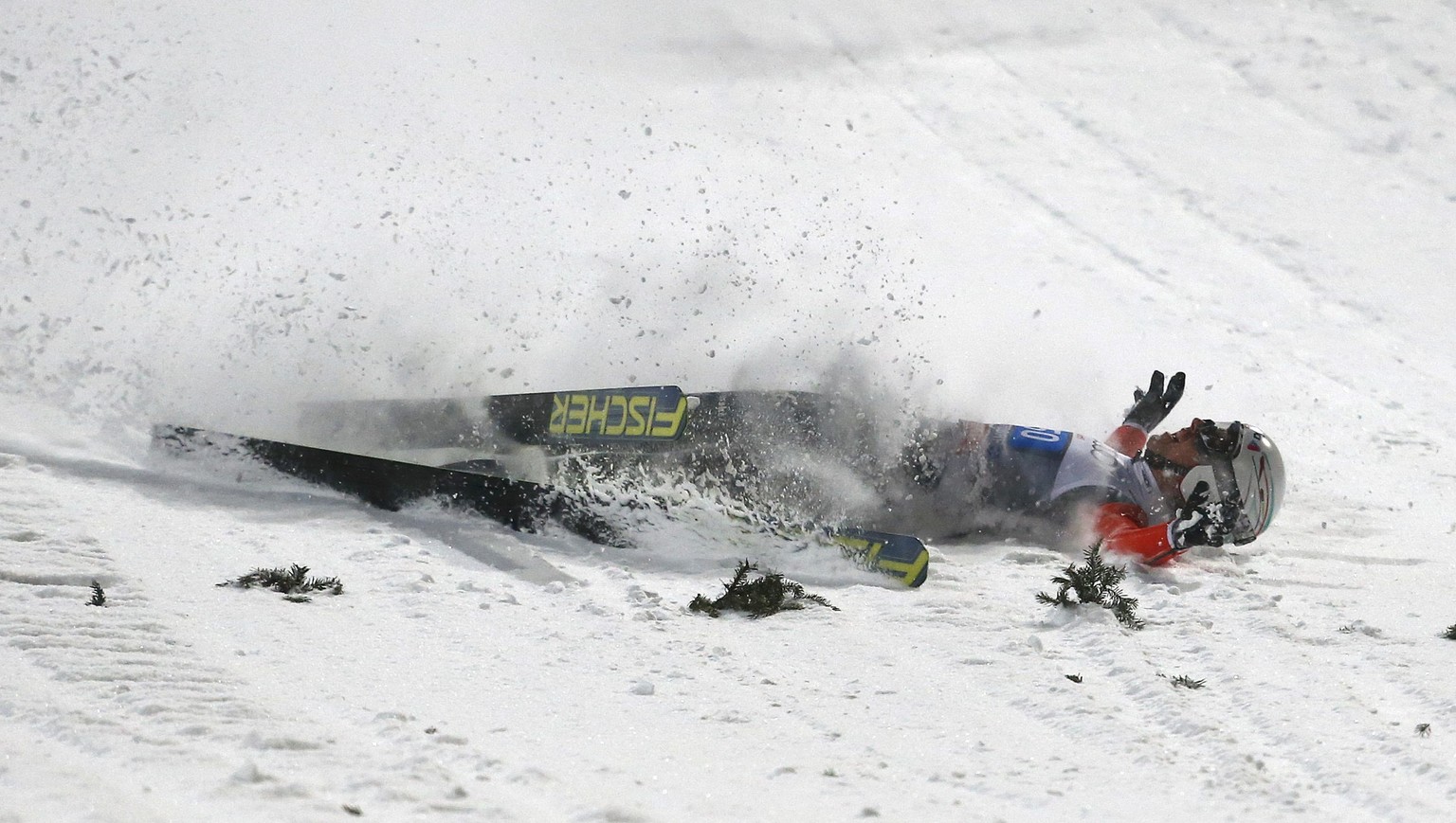 Ammann schlittert nach seinem Sturz über den Auslauf in Oberstdorf.