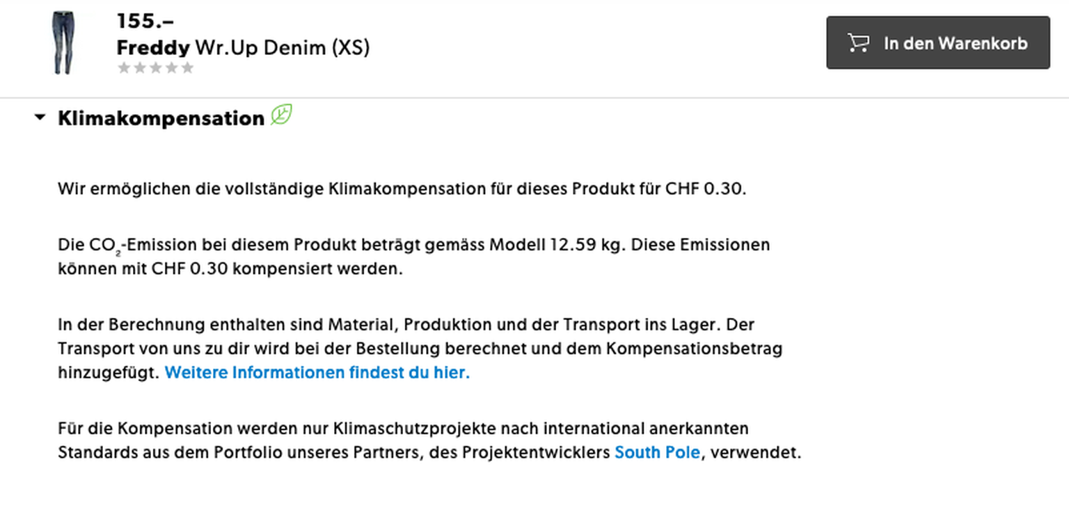 Eine Jeans kann man bei Galaxus mit einem Aufpreis von 30 Rappen klimaneutral kaufen.