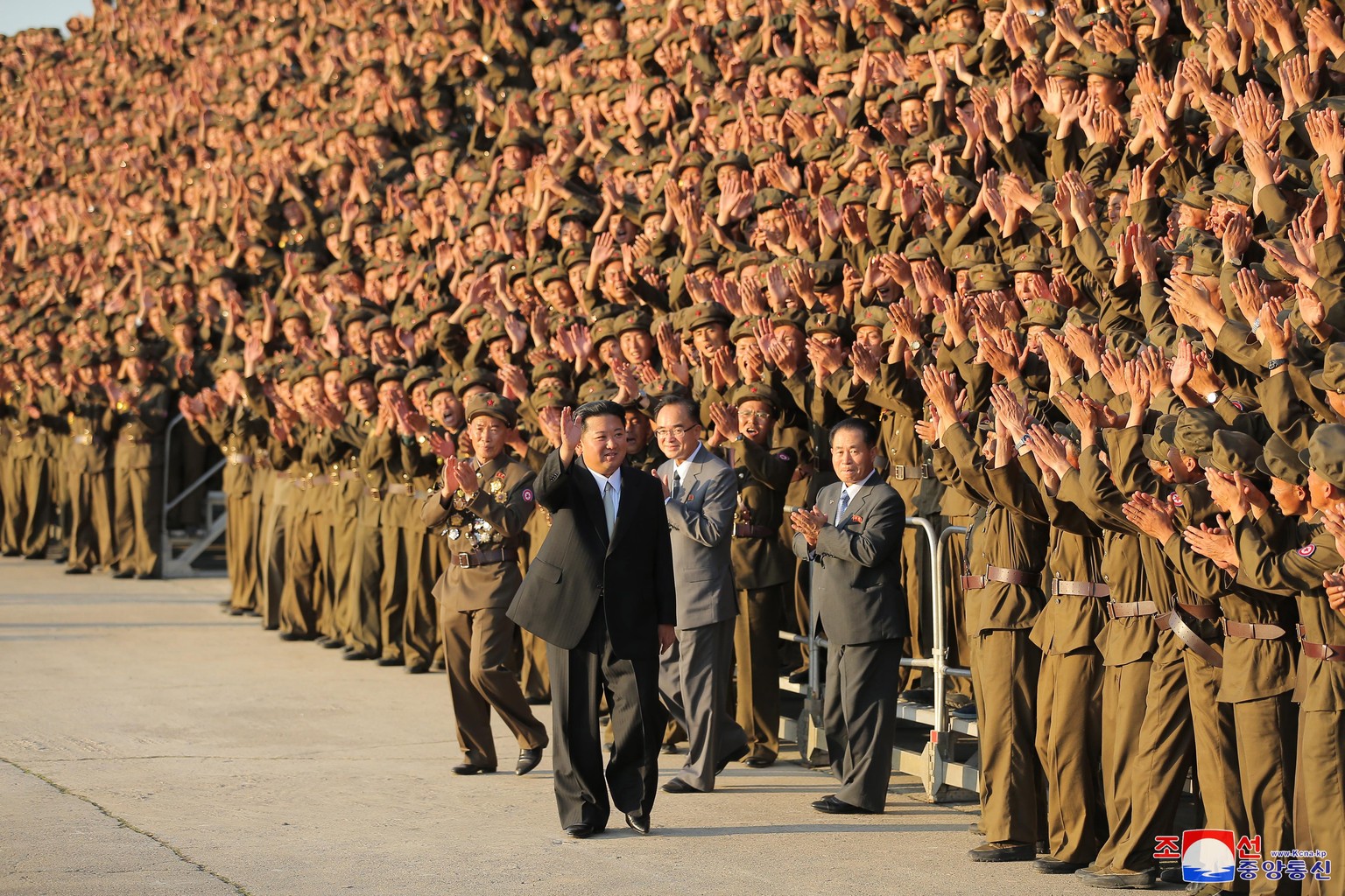 Ein sichtlich erschlankter Kim Jong Un hat sich entschieden, im lockeren Beinkleid vor den Militärs zu defilieren. Dass es sich dabei um einen alten, mittlerweile zu grossen Anzug handelt, kann ausgeschlossen werden.