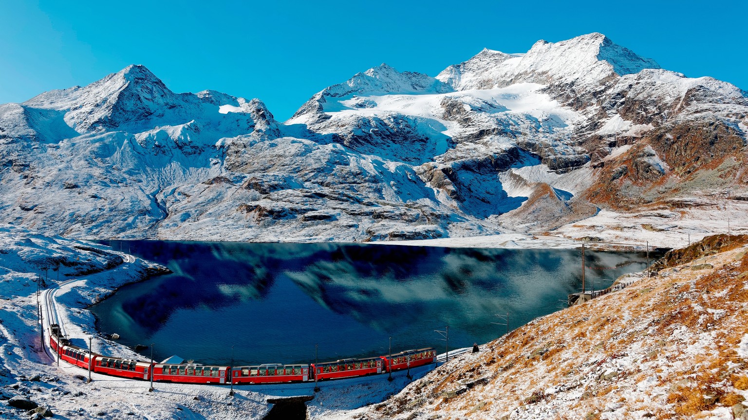 Kanton der Berge, des Wassers und der Rhätischen Bahn: Ein Zug passiert den Lago Bianco auf dem Berninapass.