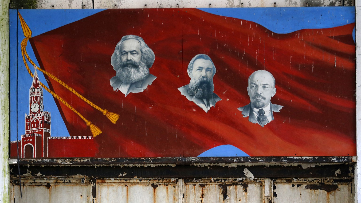 Marx, Engels und Lenin auf einem Wandgemälde in einer ehemaligen Sowjet-Militärbasis in Ungarn.