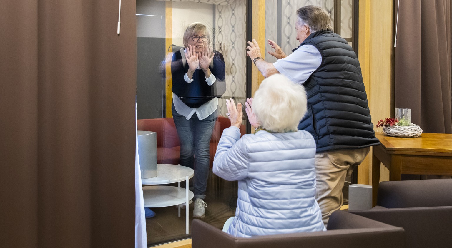 Soziale Kontakte trotz Zuhausebleiben: Eine Frau besucht ihre Eltern in einem Pflegeheim in Thun. Die Besucherbox ist durch eine Glasscheibe unterteilt.